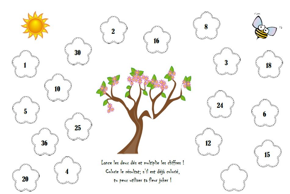 Pour jouer il faut deux dés, l'élève les lance et multiplie les chiffres. Il colorie ensuite la fleur associée. Il y a une fleur joker dans le cas où le nombre est déjà colorié.